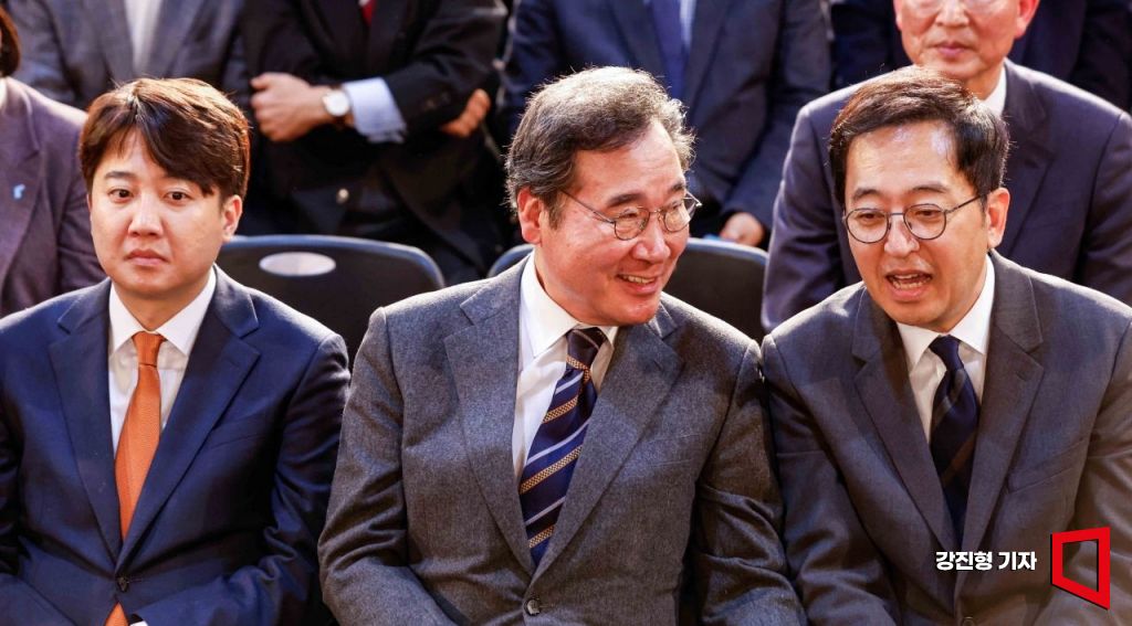 더불어민주당을 탈당한 이낙연(가운데) 전 대표와 금태섭 새로운선택 공동대표가 16일 서울 동작구 서울여성플라자에서 열린 '새로운미래 창당 발기인대회'에 참석해 대화하고 있다.