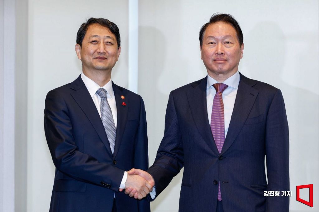안덕근(왼쪽) 산업통상자원부 장관과 최태원 대한상공회의소 회장이 17일 서울 중구 대한상공회의소에서 면담에 앞서 악수하고 있다.
