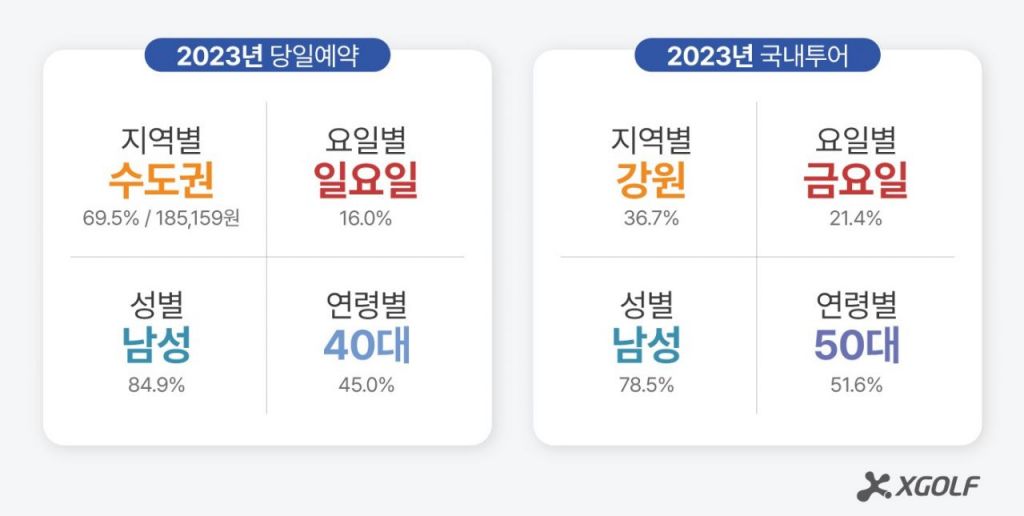 지난해 골프장 플랫폼을 통해 당일예약을 가장 많이 한 골퍼들의 성향이다. 112만명의 누적 회원수를 보유한 국내 골프 부킹 플랫폼 엑스골프(XGOLF)는 최근 2023년 골프장 이용현황 결산 자료를 공개했다. 이용 형태에 따라 1일 라운드인 ‘당일예약’과 2일 이상 라운드와 숙박 등이 패키지로 구성된 ‘국내투어’로 분류했다.