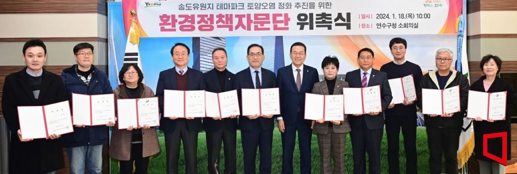 지난 18일 열린 '송도유원지 테마파크 토양오염 정화 추진을 위한 환경정책자문단 위촉식'에서 이재호 인천 연수구청장(오른쪽 여섯번째)과 자문위원들이 기념촬영을 하고 있다. 2024.1.22 [사진 제공=인천 연수구]