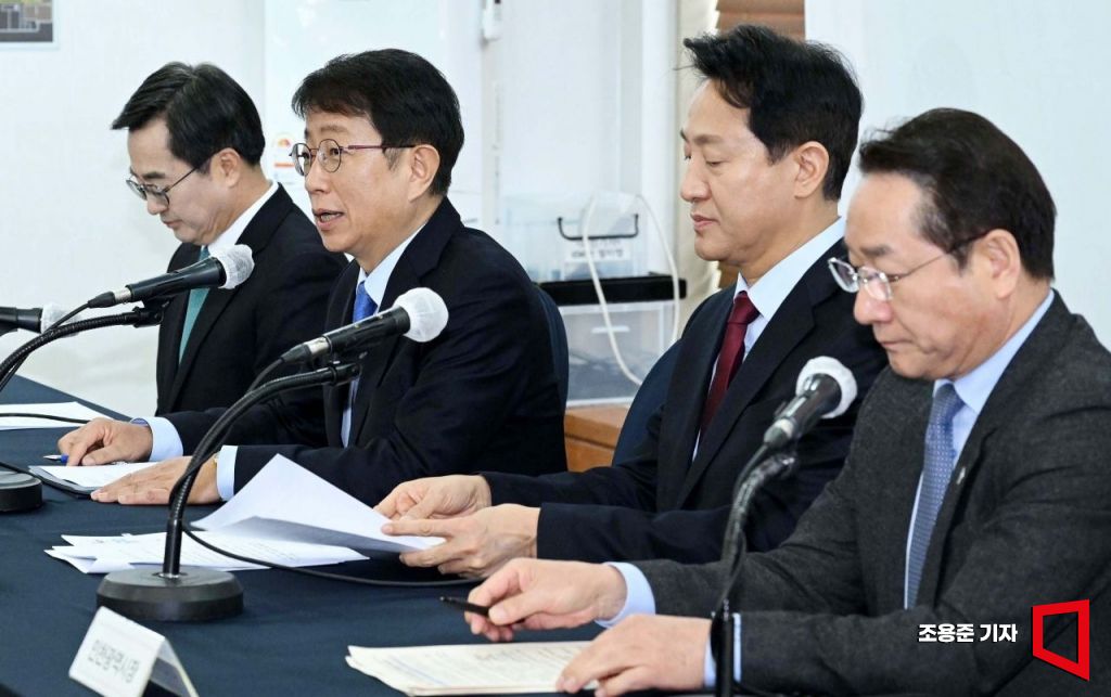 박상우 국토교통부 장관(왼쪽 두번째)이 22일 서울 중구 프레스센터에서 대중교통 지원 사업 관련 합동 기자설명회에 참석해 발언하고 있다. 사진은 왼쪽부터 김동연 경기도지사, 박상우 장관, 오세훈 서울시장, 유정복 인천시장. / 사진=조용준 기자 jun21@