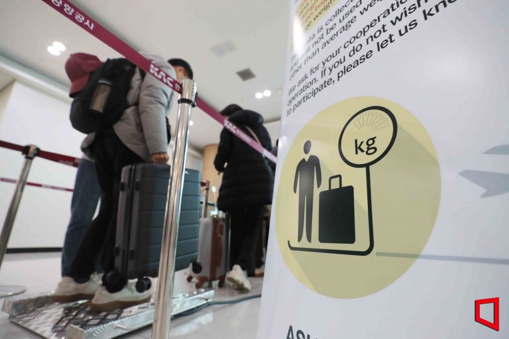 22일 김포국제공항 국제선 출국장에서 한 탑승객이 몸무게를 측정받고 있다. 아시아나항공은 승객 표준 중량 측정을 위해 오는 31일까지 국제선 항공기에 탑승하는 승객들의 몸무게를 측정한다. 승객 표준 중량은 국토교통부 '항공기 중량 및 평형 관리기준'에 따라 항공사들마다 최소 5년마다 혹은 필요시 승객 표준 중량을 측정한다. 측정 값은 익명으로 기록되며 원하지 않으면 거부할 수 있다. 사진=공항사진기자단