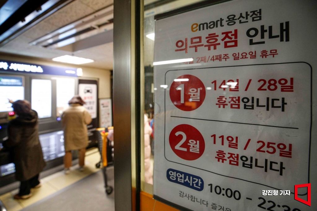 정부가 대형마트 의무 휴업 폐지안을 밝힌 22일 서울 한 대형마트에 의무 휴업 안내문이 붙어 있다. 정부는 '국민과 함께하는 민생토론회'에서 대형마트에 적용하는 공휴일 의무 휴업 규제를 폐지하고, 영업 제한 시간의 온라인 배송을 허용하는 내용의 유통산업법 개정을 추진한다고 밝혔다.
