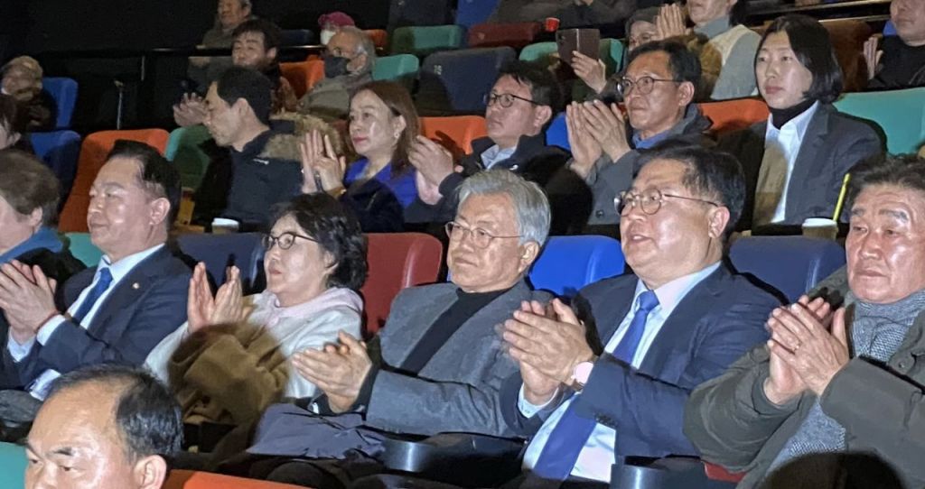 문 전 대통령은 영화를 관람한 후 이번 총선에 출마할 양산지역 갑·을 후보들과 함께 스크린 앞에 서서 "오늘 '길 위에 김대중' 영화를 지역 당원들과 함께 보자는 제안을 제가 직접 했다"며 "오늘 영화가 아주 감동적이었다"라고 밝혔다.