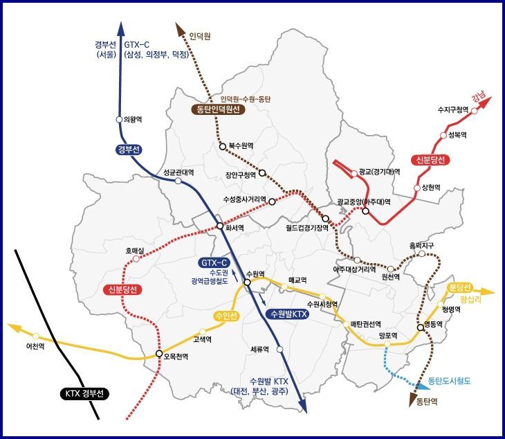 2020년 1월 예비타당성조사를 통과한 ‘신분당선 광교~호매실 구간 연장 사업’은 착공 예정이고, 인덕원(안양)을 출발해 수원을 거쳐 동탄(화성)까지 이어지는 ‘동탄인덕원선 복선 전철 건설사업’도 착공을 앞두고 있다.