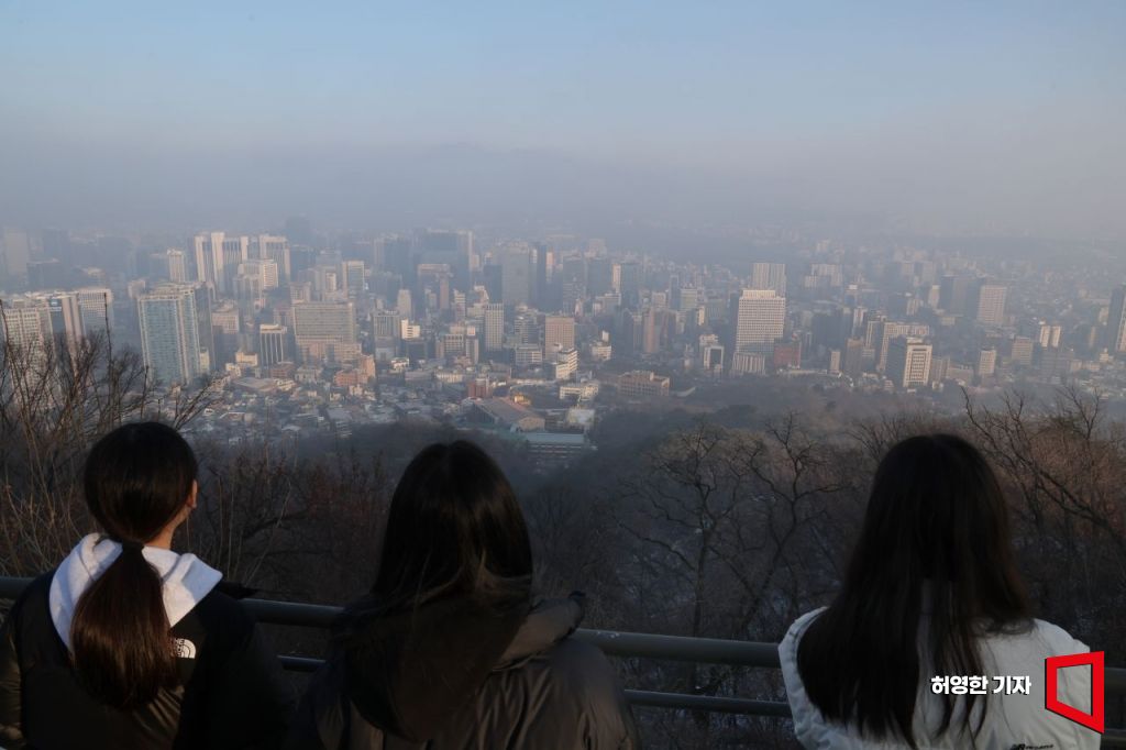남산 공원에 온 시민들이 뿌연 안개로 덮힌 서울 도심을 내려다보고 있다. 사진=허영한 기자 younghan@