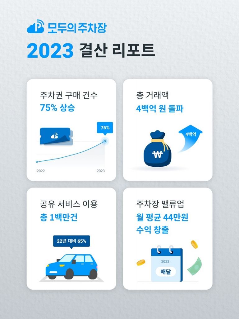 모두의주차장이 발표한 2023년 결산 리포트에 따르면 지난해 이용자 약 200만명의 총 거래액은 400억원을 넘어서 1년 사이 39% 증가했다.