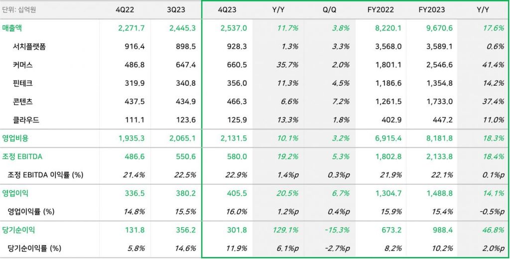 최수연 네이버 대표는 "2023년은 어려운 대내외 환경 속에서도 견조한 매출 성장률을 만들어내고 신중한 비용 집행을 통한 수익성 강화를 위해 노력했던 한 해였다"며 "올해에도 네이버는 AI와 데이터를 기반으로 검색, 커머스 등 핵심 사업의 경쟁력 강화에 역량을 집중하겠다"고 말했다.