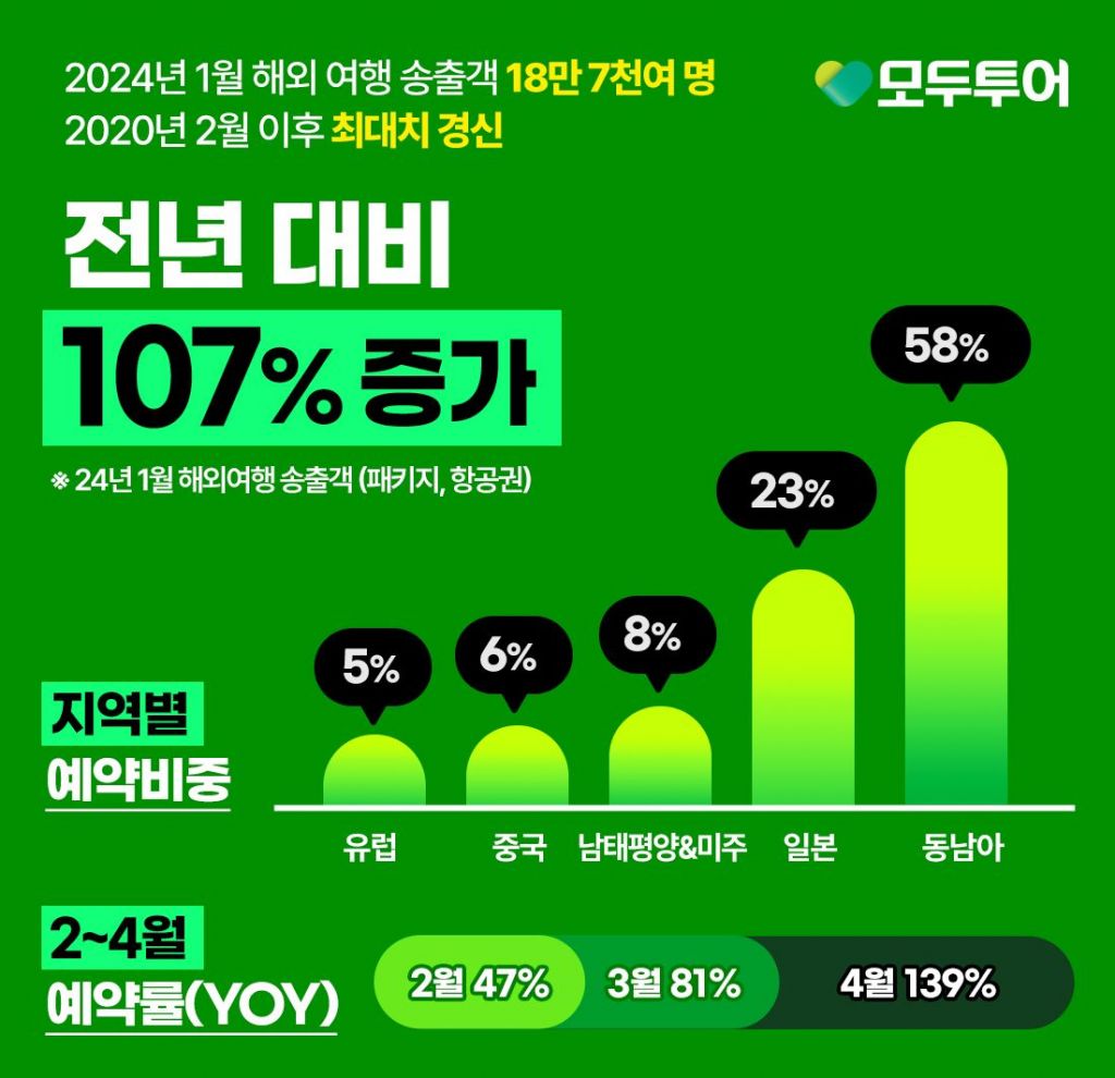 모두투어는 올해 1월 해외여행 송출객 수(패키지, 항공권 포함)가 18만7000여명으로 전년 동기 대비 107%가량 증가했다고 밝혔다. 지역별 비중은 동남아시아(58%)가 가장 높았고 일본(23%)과 남태평양·미주(8%), 중국(6%), 유럽(5%) 순으로 나타났다. 올해 설 연휴 기간 해외여행 예약 건수는 전년 동기 대비 78% 증가했고 상반기 해외여행 패키지 예약률도 2월(47%), 3월(81%), 4월(139%) 모두 꾸준히 증가하는 등 상승세를 이어가고 있다.