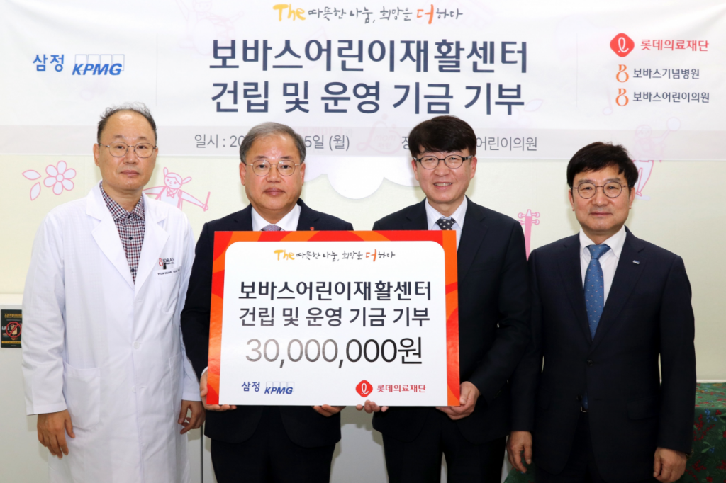 삼정KPMG는 6일 "전날 롯데의료재단과 함께 보바스어린이의원에서 소아 재활 치료기관을 위한 후원금(3000만원) 전달식을 진행했다"고 밝혔다.