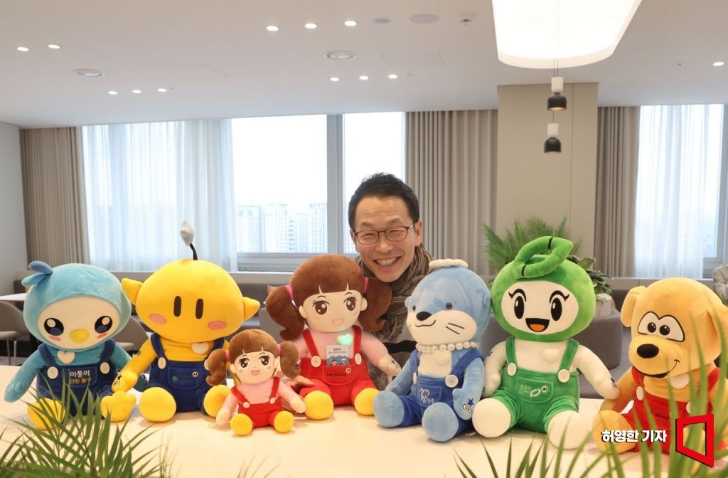 미스터마인드 김동원 대표가 전국 지자체에 납품한 인공지능 어르신 말동무 인형들과 함께 포즈를 취했다. 사진=허영한 기자 younghan@