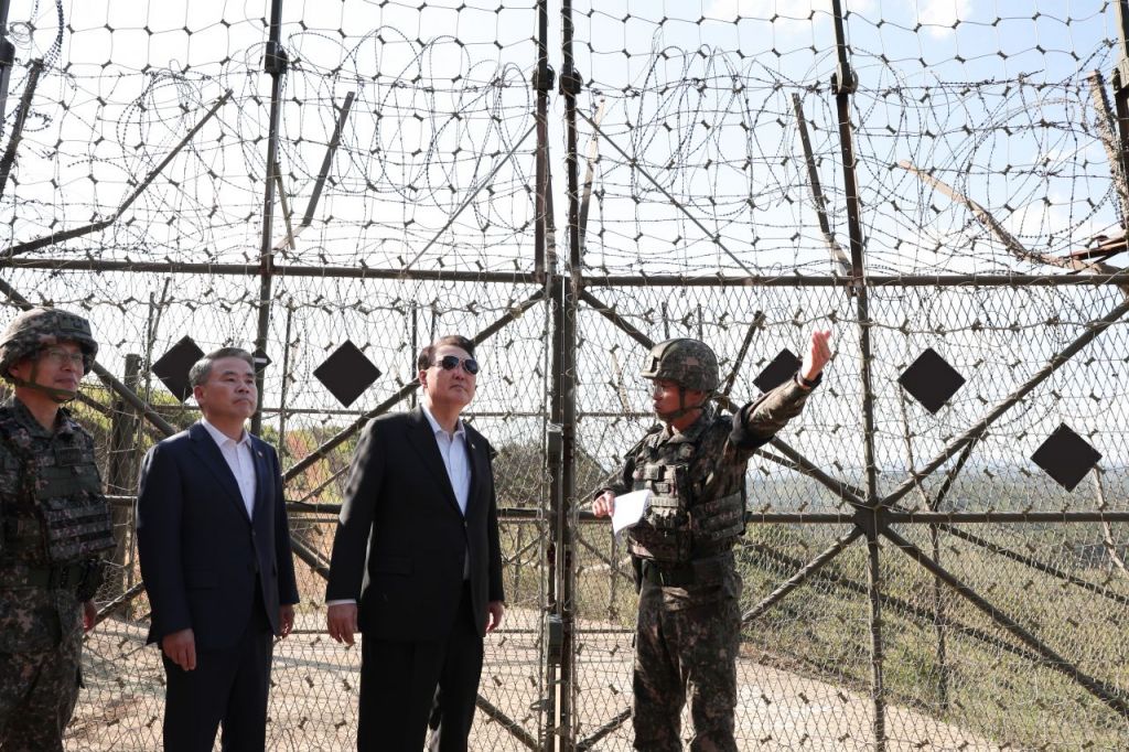 윤석열 대통령이 2023년 10월1일 추석연휴 및 국군의날을 맞아 육군 제25사단 전방부대를 방문해 장병들 격려하고 있다.