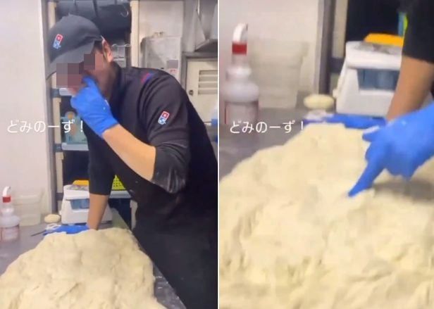 일본 도미노피자 직원이 피자 반죽에 코 판 손을 문지르는 영상이 확산해 위생 논란이 불거졌다.