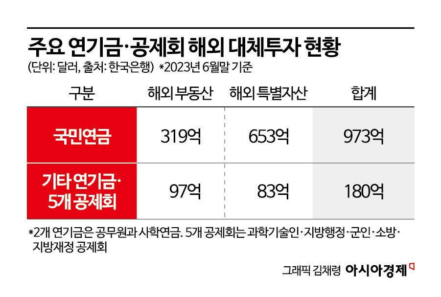 연기금·공제회의 해외 부동산 투자 가운데 상업용 부동산 비중은 73%에 달한다. 투자 지역은 북미(49%)와 유럽(28%) 비중이 높다. 모두 상업용 부동산 시세가 크게 하락한 지역이다. 한국은행은 지난해 보고서에서 "투자 위험도가 높은 중·후순위 투자가 대부분"이라며 "해외 대체투자는 리스크가 과소 평가되거나 지연 반영될 수 있다는 점에서 부실 위험이 적절히 관리되지 않을 수 있다"고 우려했다.