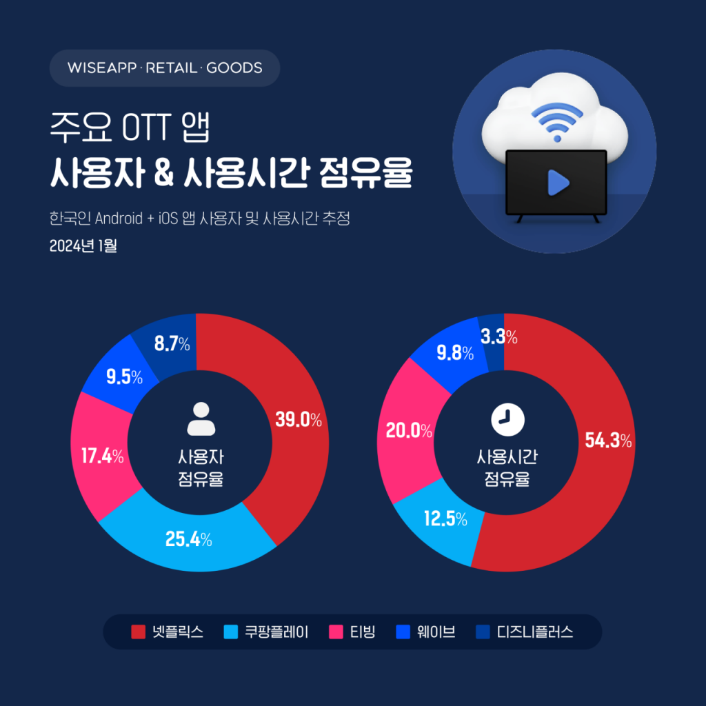 또 2024년 1월 기준 주요 OTT 앱(넷플릭스, 쿠팡플레이, 티빙, 웨이브, 디즈니플러스) 중 사용자 점유율 1위, 사용 시간 점유율 1위 모두 '넷플릭스'가 차지한 것으로 추정됐다. 넷플릭스의 사용 시간은 8809만 시간으로 점유율은 54.3%였다. 이어 티빙(20.0%·3248만 시간), 쿠팡플레이(12.5%·2021만 시간), 웨이브(9.8%·1592만 시간), 디즈니플러스(3.3%·541만 시간) 순이었다.