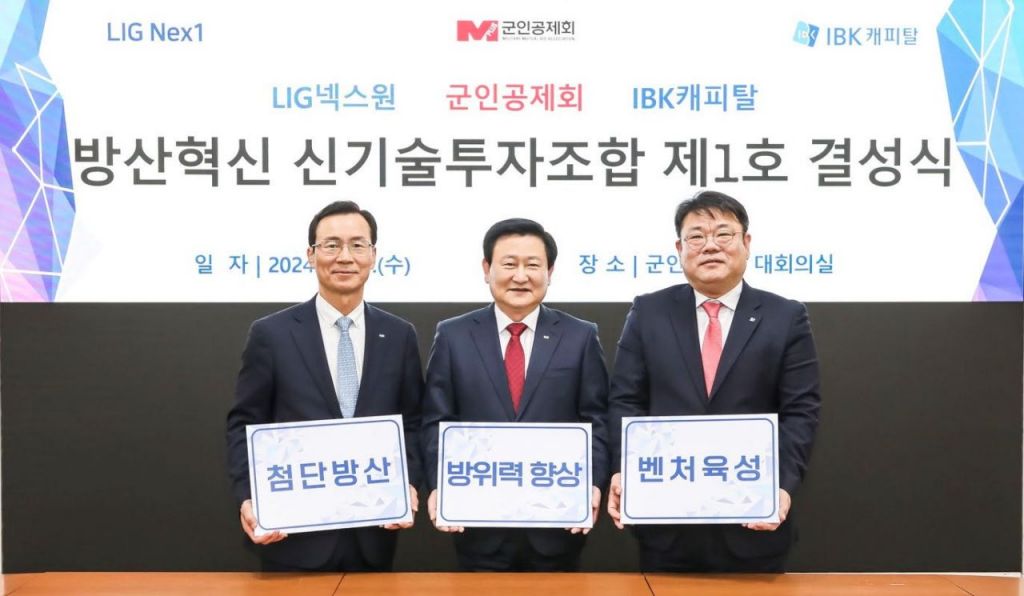 군인공제회는 14일 서울 강남구 군인공제회 대회의실에서 ‘LIG넥스원·IBK캐피탈 방산혁신 신기술투자조합 제1호’ 조성을 위한 결성식을 진행했다. (왼쪽부터) 신익현 LIG넥스원 사장, 정재관 군인공제회 이사장, 함석호 IBK캐피탈 사장[사진제공=군인공제회]