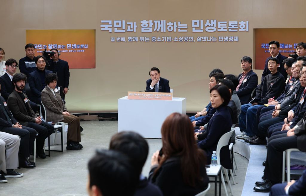 윤석열 대통령이 지난 8일 서울 성동구 레이어57에서 열린 '국민과 함께하는 민생토론회 - 열 번째, 함께 뛰는 중소기업·소상공인, 살맛나는 민생경제'에서 토론자들의 발언을 듣고 있다. [사진 제공=연합뉴스]