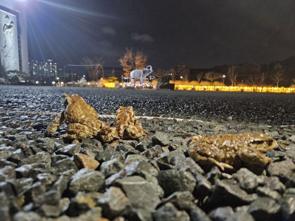 겨울잠을 자고 있던 두꺼비들이 봄비가 내리는 소리에 깨어나 산란을 위해 망월지로 이동하는 모습이 포착된 것이다.
