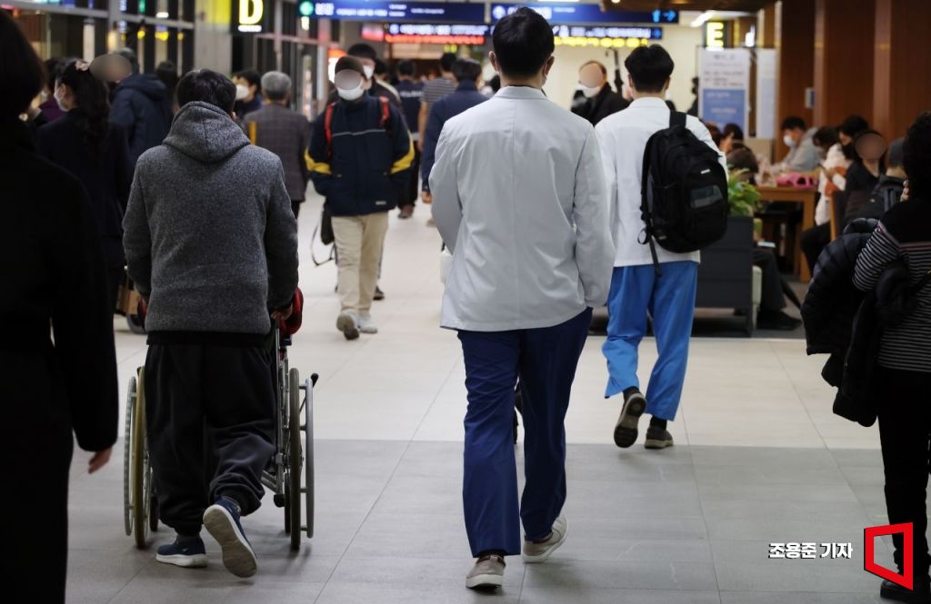 의사단체가 정부의 의대 증원 방침에 반발하며 전국 곳곳에서 동시다발 궐기대회를 예고한 15일 서울의 한 대학병원에 의료진이 이동하고 있다. 사진=조용준 기자 jun21@