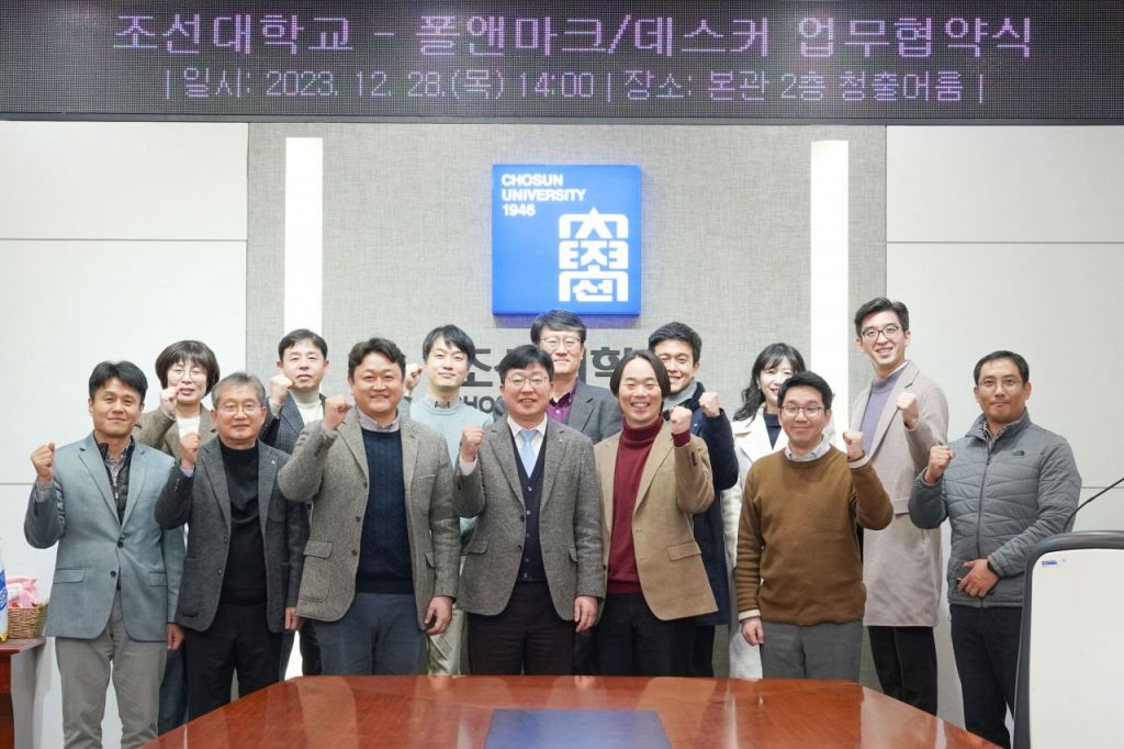 이날 업무협약식에는 조선대 김춘성 총장, 전제열 부총장, 권구락 기획조정실장, 최재웅 폴앤마크 대표, 이상범 데스커 총괄 등이 참석했다.