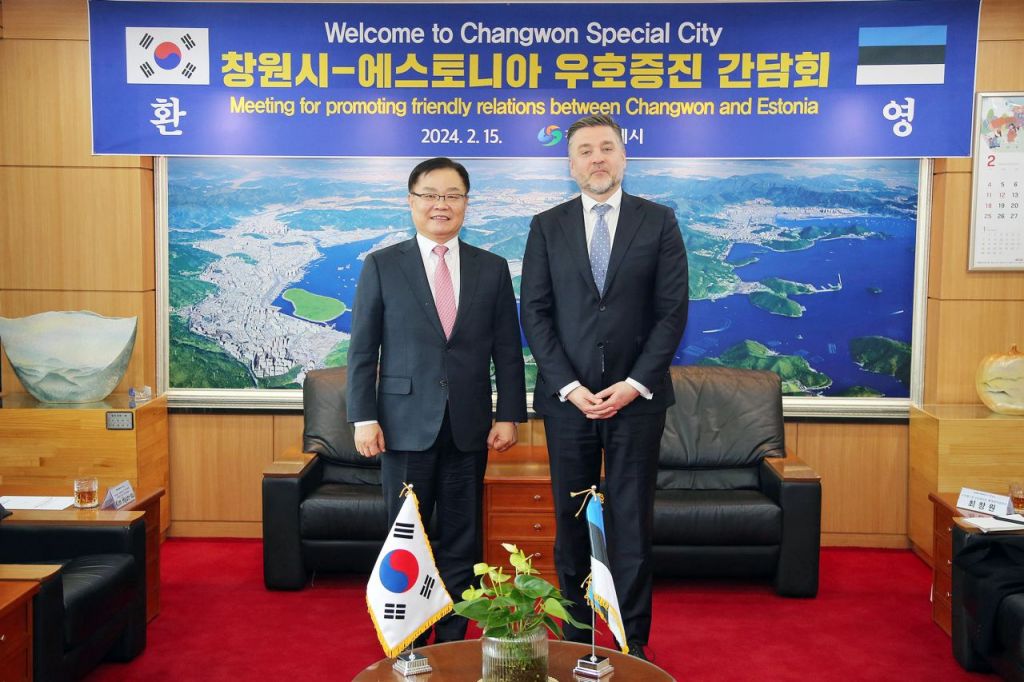 홍남표 경남 창원특례시장이 15일 오후 시청 접견실에서 스텐 슈베데 주한 에스토니아 대사를 영접하고 양국 간 다양한 경제·산업 교류 방안에 대해 논의했다.