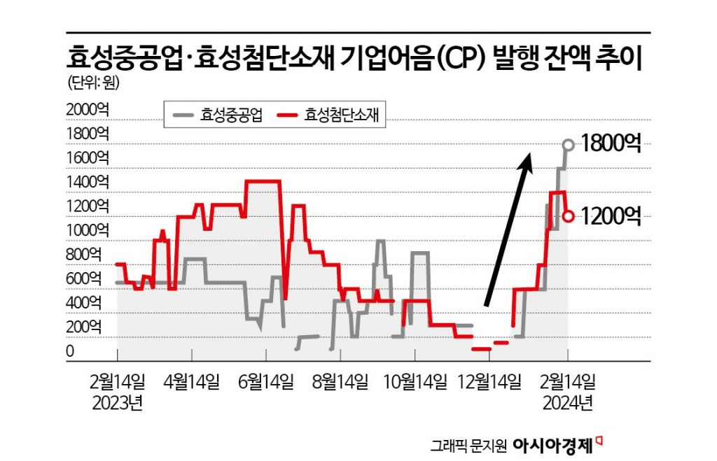 효성첨단소재의 CP 발행 잔액도 연초 0원에서 최근 1400억원으로 늘어났다. 1월에 여러 차례에 걸쳐 CP 잔액을 1000억원으로 늘렸고 2월에 400억원을 추가로 순발행하면서 잔액이 계속 증가하는 추세다. 효성중공업과 효성첨단소재의 CP 잔액은 1년 내 최고치로 늘어난 상태다.