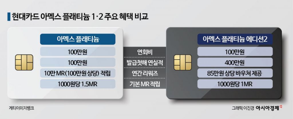 16일 업계에 따르면 현대카드는 전날 현대 아메리칸 익스프레스 센츄리온 플래티늄·골드·그린 카드 3종을 단종하고 이를 각각 업그레이드한 에디션2 버전을 출시했다. 이 중 연회비가 100만원인 '아멕스 플래티늄(현아플)'은 소비자들 사이에서 가장 인기가 많았던 카드다. 카드를 발급받기 위해선 일정 수준의 연소득을 충족해야 하는 등 발급조건이 까다롭지만 연회비를 상쇄하고 남을 정도로 혜택이 많아 이른바 '혜자 카드'로 통했다. 하지만 이번 리뉴얼로 현아플은 더이상 옛 명성을 그대로 가져가긴 어려울 것이란 얘기가 나오고 있다.