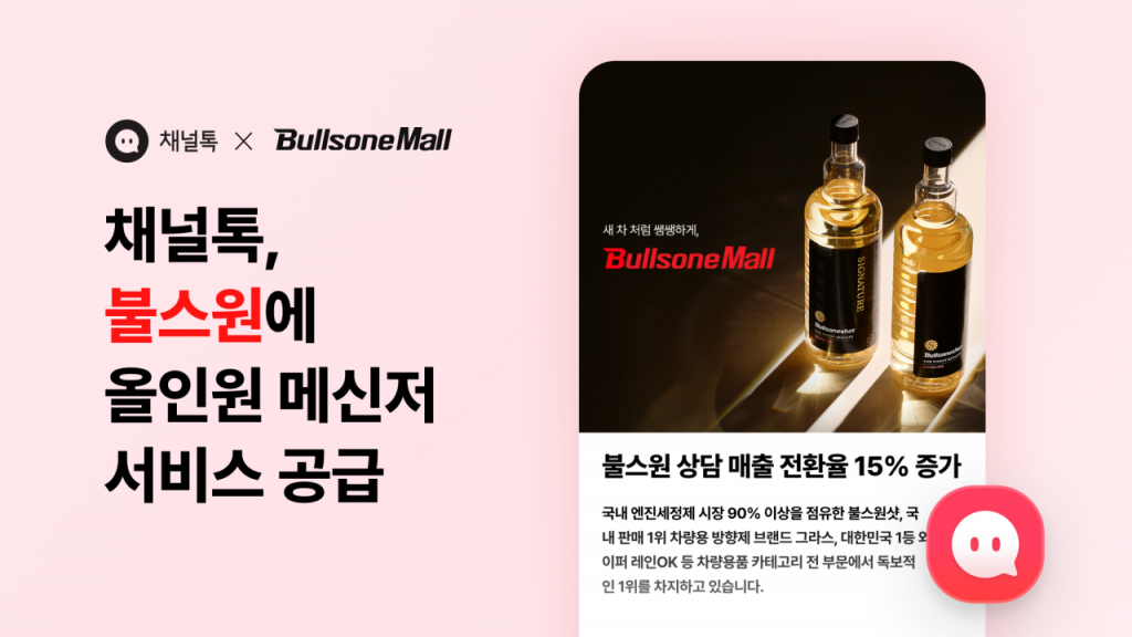 채널코퍼레이션은 자동차용품 전문 기업 불스원이 올인원 인공지능(AI) 메신저 ‘채널톡’ 도입으로 상담 매출 전환율이 15% 증가하는 성과를 거뒀다고 16일 밝혔다.