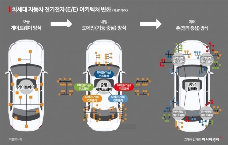 기존 내연기관 차량에는 많게는 100개 이상의 ECU가 탑재된다. 사람으로 치면 팔·다리, 내장기관, 손가락 관절마다 뇌가 따로 붙어있는 셈이다. 이는 기존 완성차 업체의 수직계열화된 공급 구조 때문이다. 주문자위탁생산(OEM)은 1차 부품사에서 모듈화(덩어리)된 형태로 부품을 공급받는다. 각 모듈에는 HW와 이를 제어하는 ECU가 하나의 패키지로 묶여있다. 제조사는 1차 부품사에서 모듈을 공급받아 최종 조립하고 잘 작동하는지 검수한다.