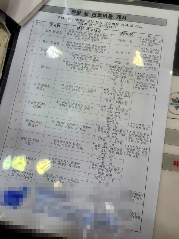 서울 한 동물병원의 진료비용 목록.[사진=이서희 기자]