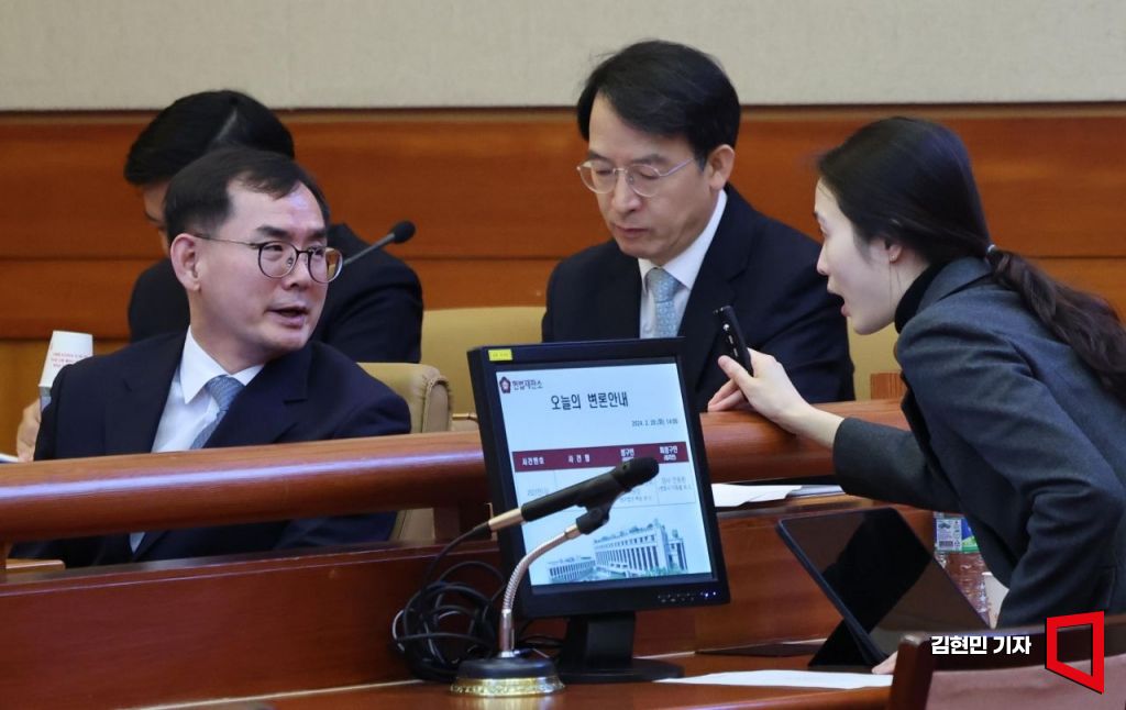 이른바 '간첩조작 사건'의 피해자 유우성 씨를 보복기소했다는 이유로 탄핵소추된 안동완 부산지검 2차장검사의 탄핵심판 사건 첫 변론기일이 20일 헌법재판소에서 열렸다. 안 검사가 변호인과 대화하고 있다. 사진=김현민 기자 kimhyun81@