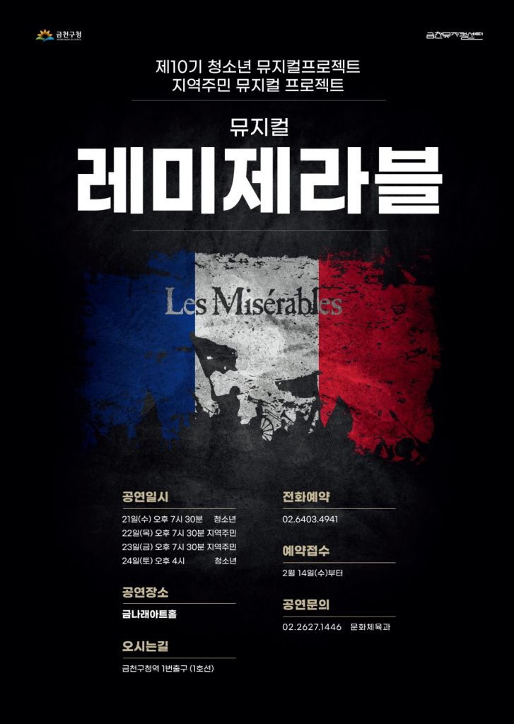 금천구(구청장 유성훈)는 2월 21일부터 24일까지 청소년과 지역주민이 공연하는 뮤지컬 ‘레미제라블’ 작품을 금나래아트홀에서 개최한다고 밝혔다.
