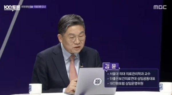 김윤 서울대 의대 의료관리학과 교수는 20일 MBC ‘100분 토론’에 출연해 "2019년 연봉 2억원 남짓하던 종합병원 봉직의 연봉이 최근 3억~4억원까지 올랐다"며 "이는 공급이 부족하기 때문"이라고 말했다. 이어 그는 "대학병원에서 전공의들이 80시간을 일한다. 의사가 부족하지 않은데 80시간을 일할까"라며 "대학병원은 PA라는 간호사 위주의 진료 보조 인력을 2만 명 가까이 쓰고 있다. 의사가 부족하지 않은데 그런 일이 생기겠느냐"고 지적했다.