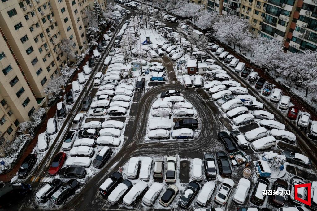 수도권에 대설주의보가 발령된 22일 서울 한 아파트 주차장에 눈 쌓인 차량이 주차돼 있다.