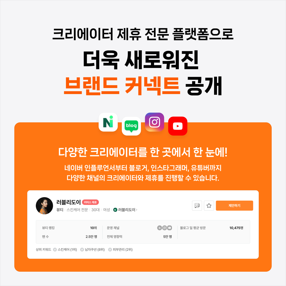 신규 브랜드 커넥트는 네이버 인플루언서뿐만 아니라 네이버 블로그, 인스타그램, 유튜브에서 활동하는 크리에이터도 가입할 수 있다. 네이버 블로거의 경우 이웃 수 1000명, 전월 방문 횟수 1만명 이상이어야 하고, 인스타그램과 유튜브의 경우 구독자(팔로워) 1만명 이상이면 크리에이터 스페이스를 개설할 수 있다.