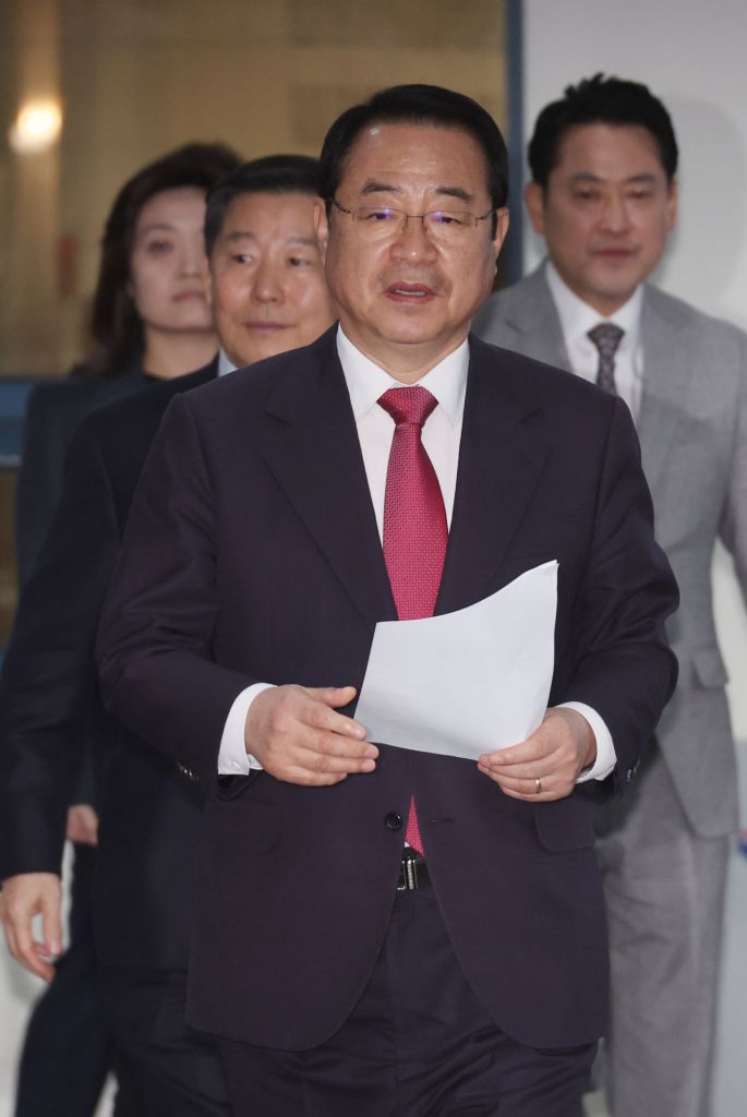 국민의힘 정영환 공천관리위원장과 위원들이 25일 서울 여의도 당사에서 1차 경선 결과를 발표하기 위해 입장하고 있다. [이미지출처=연합뉴스]