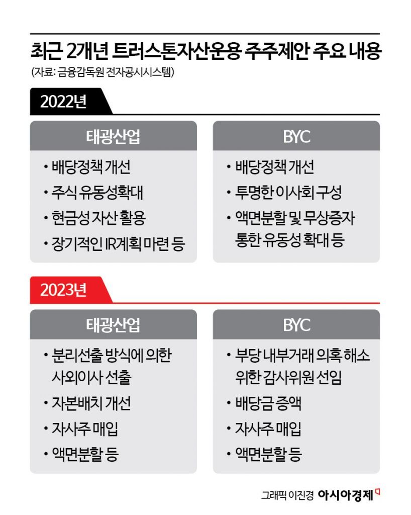 트러스톤은 이번 정기 주총에 앞서 태광산업에 보낸 주주제안으로 사내이사 1명과 감사위원을 겸하는 사외이사 2명의 선임을 요구한 것으로 전해졌다. 태광산업의 조진환·정철현 사내이사와 최원준 사외이사 감사위원회 위원의 임기는 3월에 만료된다.
