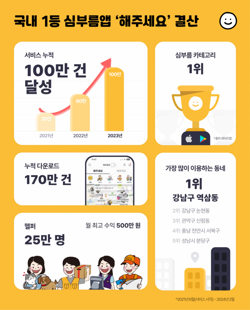 해주세요는 올 2월 기준 누적 다운로드 170만, 누적 생활대행 서비스 100만건을 달성하고 가입자는 140만 명에 달한다. 100만건의 생활대행 서비스 중 가장 많이 이용한 지역 1위는 서울시 강남구 역삼동, 2위는 논현동, 3위는 관악구 신림동이 차지했다.