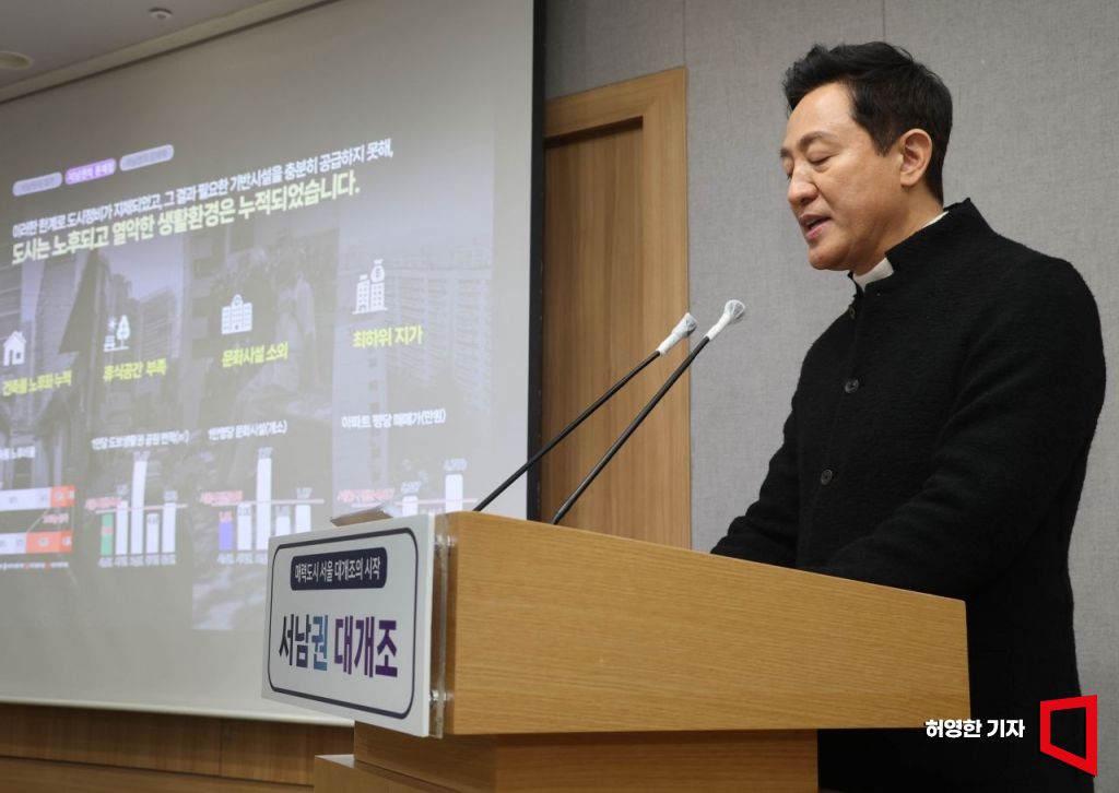 오세훈 서울시장은 27일 도시 경쟁력 강화를 위한 서울 서남권 대개조 구상을 발표했다. 60~70년대 소비·제조산업 중심지였지만 현재는 서울에서 가장 낙후된 지역으로 인식되는 서울 서남권이 직(職)·주(住)·락(樂)이 어우러진 미래 첨단도시로의 혁신을 시작한다고 밝혔다. 사진=허영한 기자 younghan@