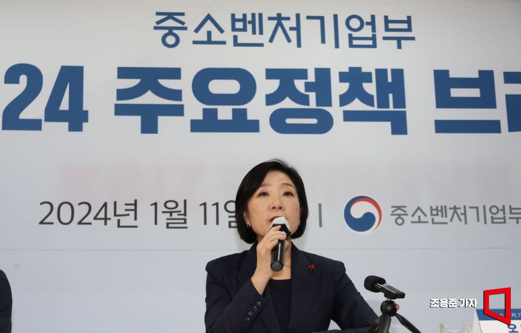 오영주 중소벤처기업부 장관이 11일 서울 영등포구 여의도 중소기업중앙회에서 열린 2024년 정책방향 브리핑에서 중기부 주요정책을 설명하고 있다. 사진=조용준 기자 jun21@