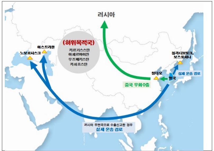또 러시아로 향하는 수출 물품의 세관 단속이 강화되면서부터는 중국을 경유해 러시아로 우회 수출하거나, 키르기스스탄 등 러시아 주변국으로 수출할 것처럼 꾸민 후 실제 운송과정에서 물품을 러시아로 빼돌리는 꼼수를 썼다.