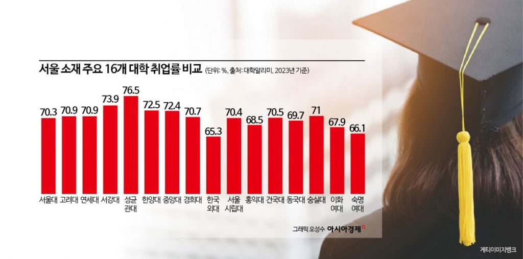 대학정보공시시스템인 '대학알리미'에서 입학시즌을 앞두고 2023년 기준 국내 주요 대학의 취업률을 공개하면서 새학기 입학을 앞둔 대학생들은 물론 취업을 준비 중인 재학생들의 관심이 높아지고 있다. 일반적으로 대학 순위의 대명사처럼 여겨지는 'SKY' 순위와 달리 실제 서울 소재 주요 대학들의 취업률은 성균관대와 서강대, 한양대 등이 높은 것으로 나타났다.