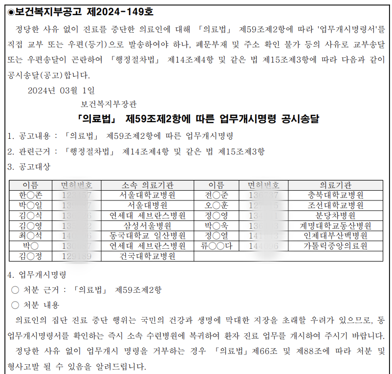 공고문은 "정당한 사유 없이 진료를 중단한 의료인에 대해 의료법 59조2항에 따라 업무개시명령서를 직접 교부 또는 우편(등기)으로 발송해야 하나, 폐문부재(문이 잠겨있고 사람이 없음) 및 주소 확인 불가 등의 사유로 교부송달 또는 우편송달이 곤란해 행정절차법에 따라 공시송달한다"며 대상자의 명단과 소속, 의사면허번호를 적었다.