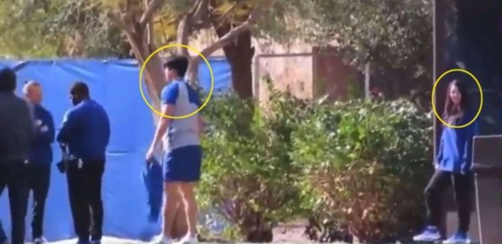 LA다저스 스프링캠프 훈련 영상에 포착된 오타니와 여성(오른쪽 원)의 모습[이미지출처=X 캡처]