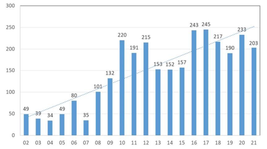 2002년~2021년 IP5에 출원된 연도별 스크린스포츠 특허 현황자료. 특허청 제공