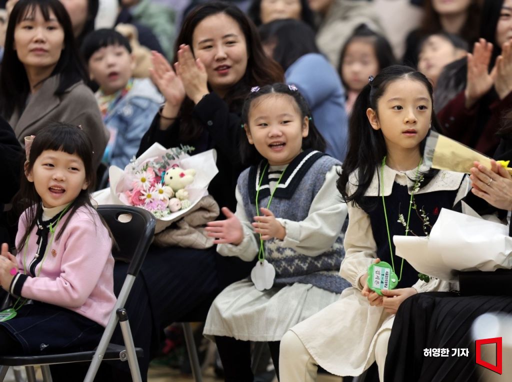 4일 서울 갈산초등학교에서 열린 2024년도 신입생 입학식에서 담임선생님 소개 시간에 학생들이 선생님 쪽을 바라보며 박수를 치고 있다.