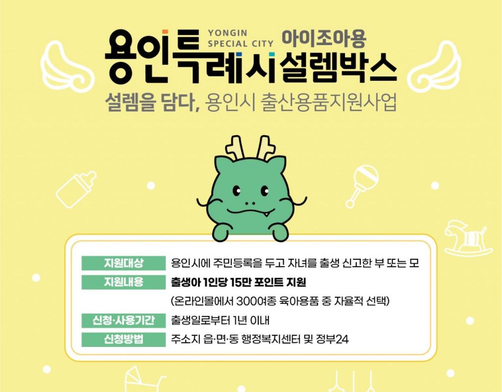 '아이조아용 설렘박스' 지원 대상은 출생일로부터 1년 이내에 용인시에 출생신고를 한 시민이다. 대상자에게는 온라인몰에서 사용할 수 있는 15만원 상당의 포인트가 지급된다. 포인트는 아이 출생일로부터 1년 이내에 신청·사용할 수 있다.