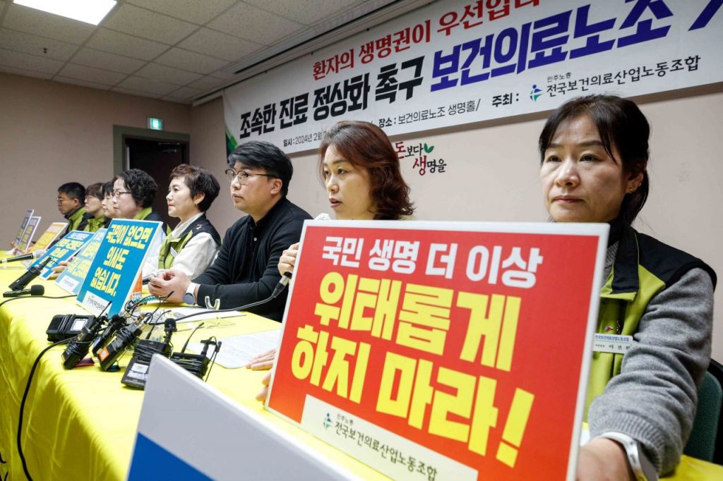 의과대학 정원 증원에 반대하며 집단 사직한 전공의 수가 1만명을 넘은 가운데 지난 2월26일 서울 영등포구 보건의료노조 생명홀에서 열린 '진료 정상화 촉구 기자회견'에 참가한 현직 간호사가 비정상화된 의료 현장에 대해 성토하고 있다. 사진=강진형 기자aymsdream@
