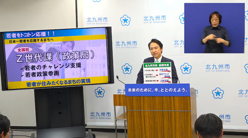 다케우치 카즈히사 기타큐슈시 시장이 Z세대과 신설에 대해 발표하고 있다.(사진출처=기타큐슈시 유튜브 채널)
