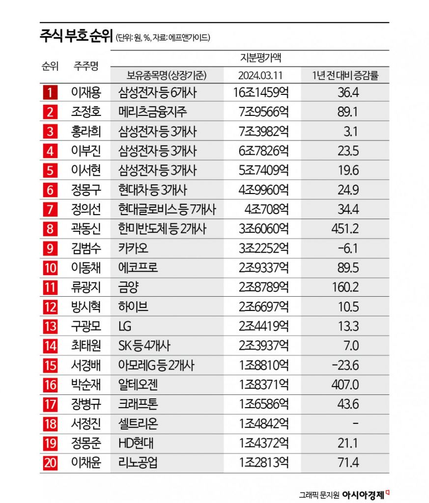 지난 1년 동안 국내 주식시장에서 인공지능(AI)과 바이오 관련 상장사 주가가 급등하면서 국내 상장사 주식 부호 상위권에 새로운 이름이 잇달아 등장했다. 잘 알려진 그룹 오너 일가를 제치고 반도체 장비업체와 신약 개발업체 대주주가 상위 20위권으로 올라섰다.